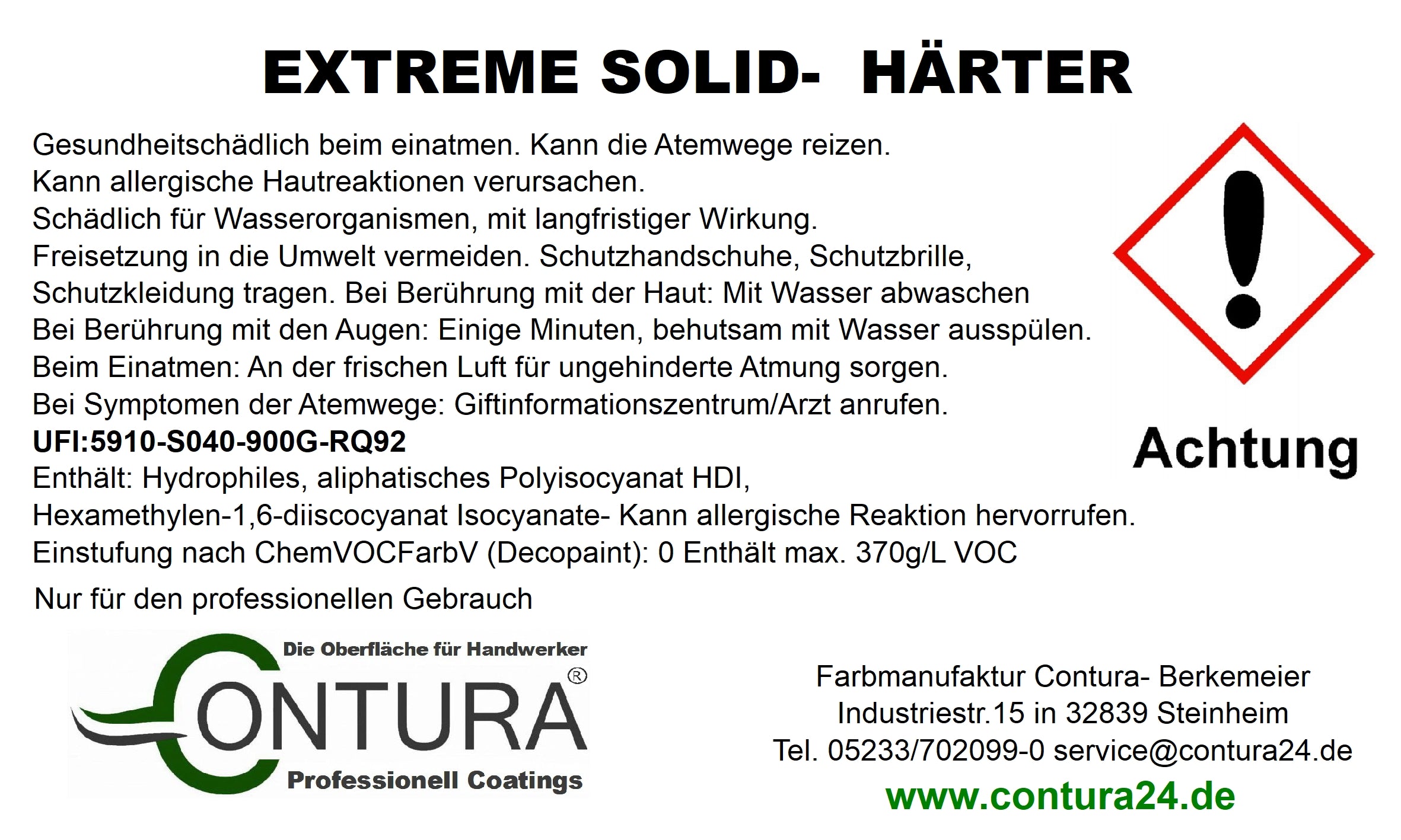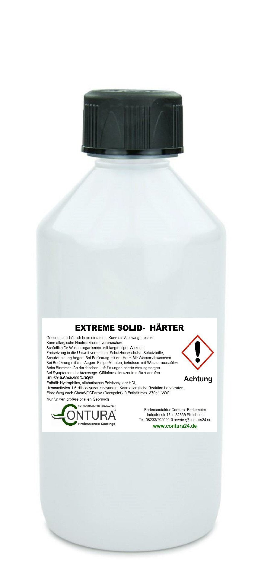 Contura "Extreme Solid" ist ein wasserbasierter Zweikomponenten (2K) -Polyurethan-Lack für die Versiegelung extrem stark beanspruchter Parkett- und Holzböden. Er ist geprüft nach DIN 53160 („Schweiß- und Speichelfest“),