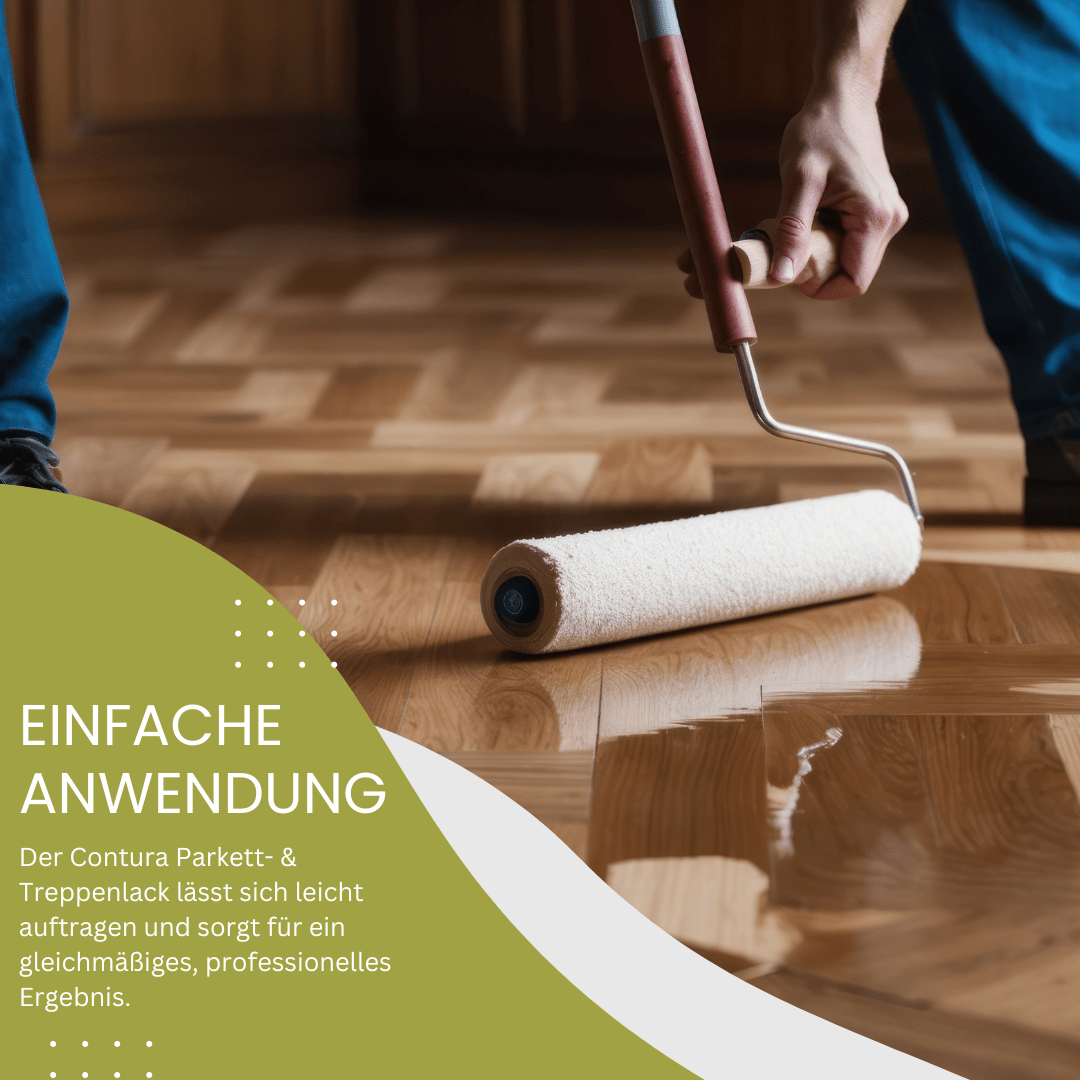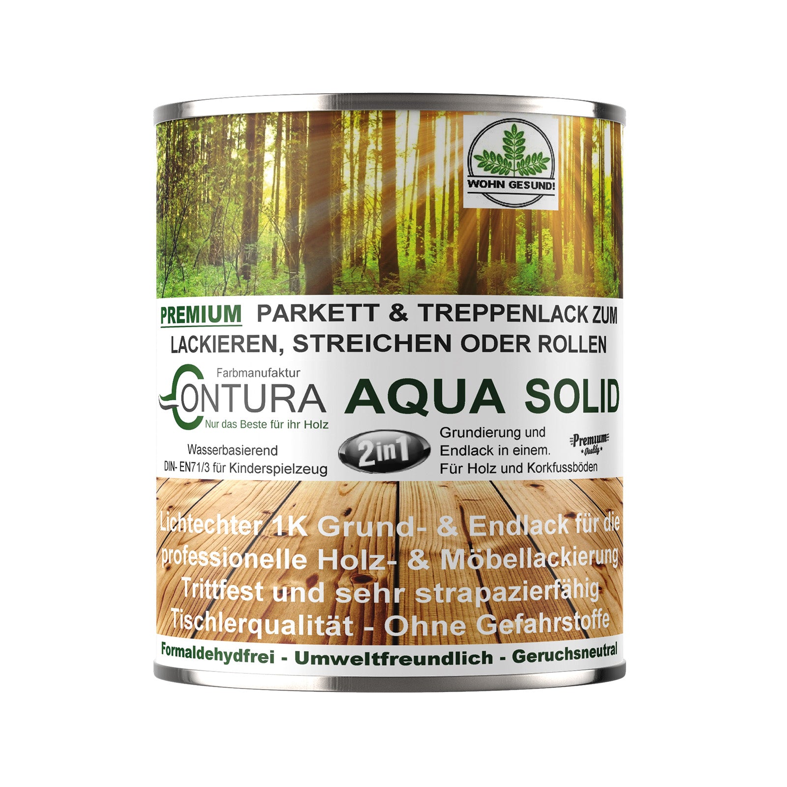 Contura AQUA SOLID "2 in 1" Profi-Parkett- und OSB-Lack. Dieser hochwertige Parkett-Holz-OSB-Fußboden- & Treppenlack ist ideal zur Versiegelung aller Parkett, Kork und Holzböden, OSB-Platten, Dielen sowie für Treppen und Paneele geeignet. Inklusive eingebaute Grundierung. Er zeichnet sich durch eine sehr hohe Füllkraft, schnelle Trocknung, hohe Kratzfestigkeit, gute Schleifbarkeit und durch eine ästhetische Optik sowie extrem widerstandsfähige Oberfläche aus. Der Lack findet auf allen Holzoberflächen seinen Einsatz! Dieser hochwertige Parkettlack weist eine sehr gute Beständigkeit gegen Wasser, Handcreme (bei Treppen) und sogar Trinkalkohol auf, er besitzt eine hohe Licht und Kratzbeständigkeit! Seine Produktstärke liegt auch in der feinen Optik. Ideal für alle Arten von Holzfußböden. Eine sehr schöne Optik, das Holz wird leicht angefeuert! Wir benutzen diesen Lack seit Jahren mit besten Ergebnissen die uns und unsere Kunden überzeugen! Absolute Sicherheit! Keine Gefahrstoff-Kennzeichnung, absolut ungiftig! Formaldehydfrei! Dieser Parkettlack ist sehr ergiebig, der Verbrauch liegt bei nur ca.10-12 qm / je Liter Ein weiterer Vorteil ist die sehr leichte und ansatzlose Verarbeitung des Materials!