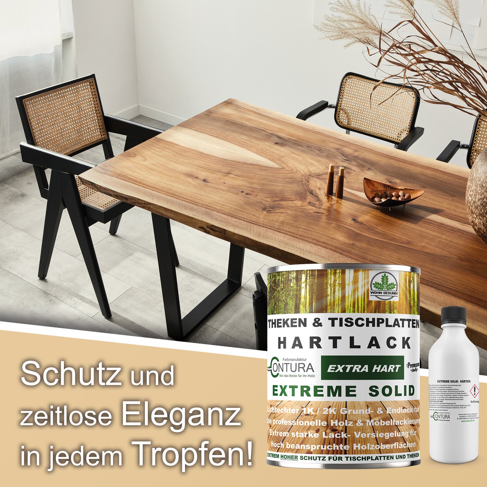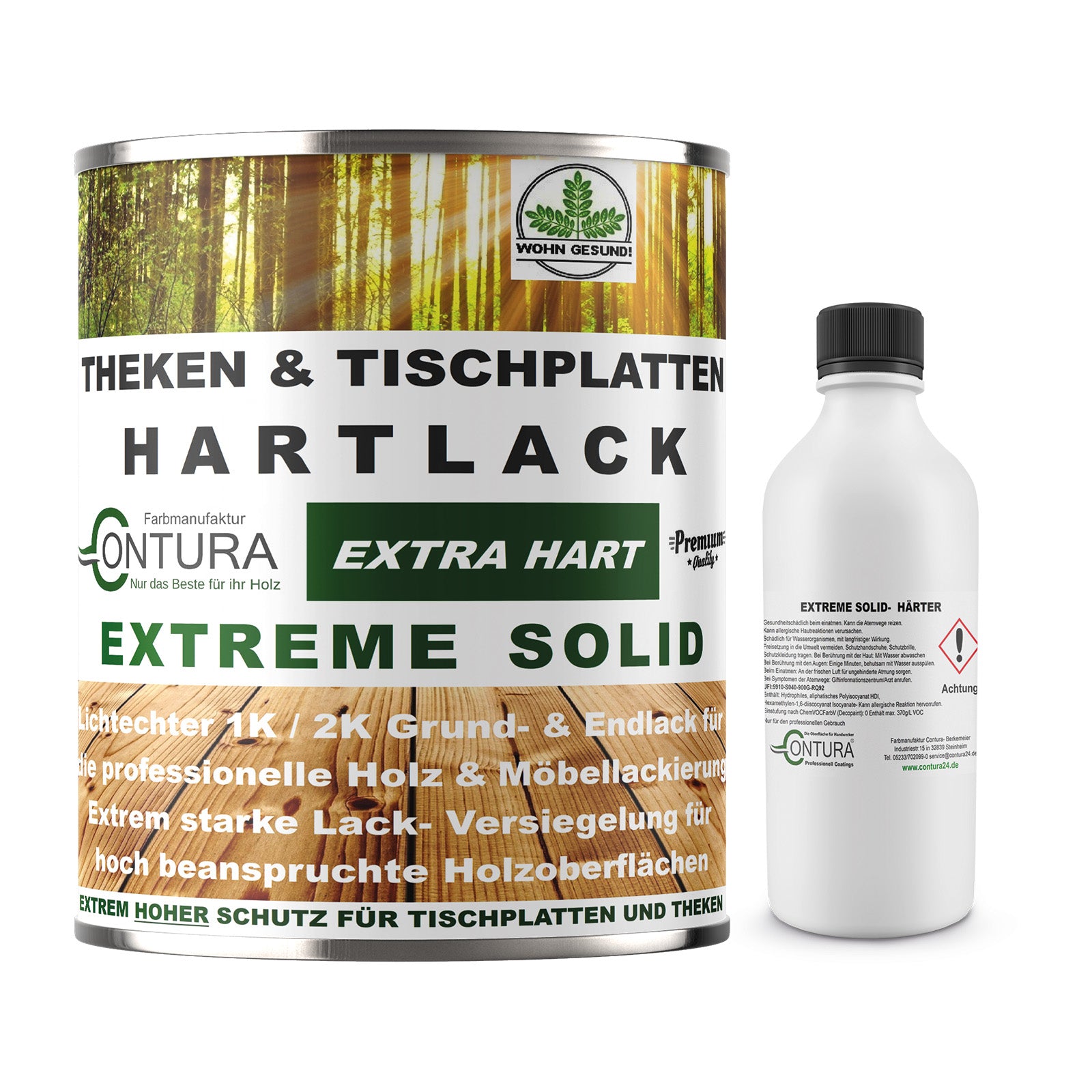 Contura "Extreme Solid" ist ein wasserbasierter Zweikomponenten (2K) -Polyurethan-Lack für die Versiegelung extrem stark beanspruchter Holzoberflächen. Er ist geprüft nach DIN 53160