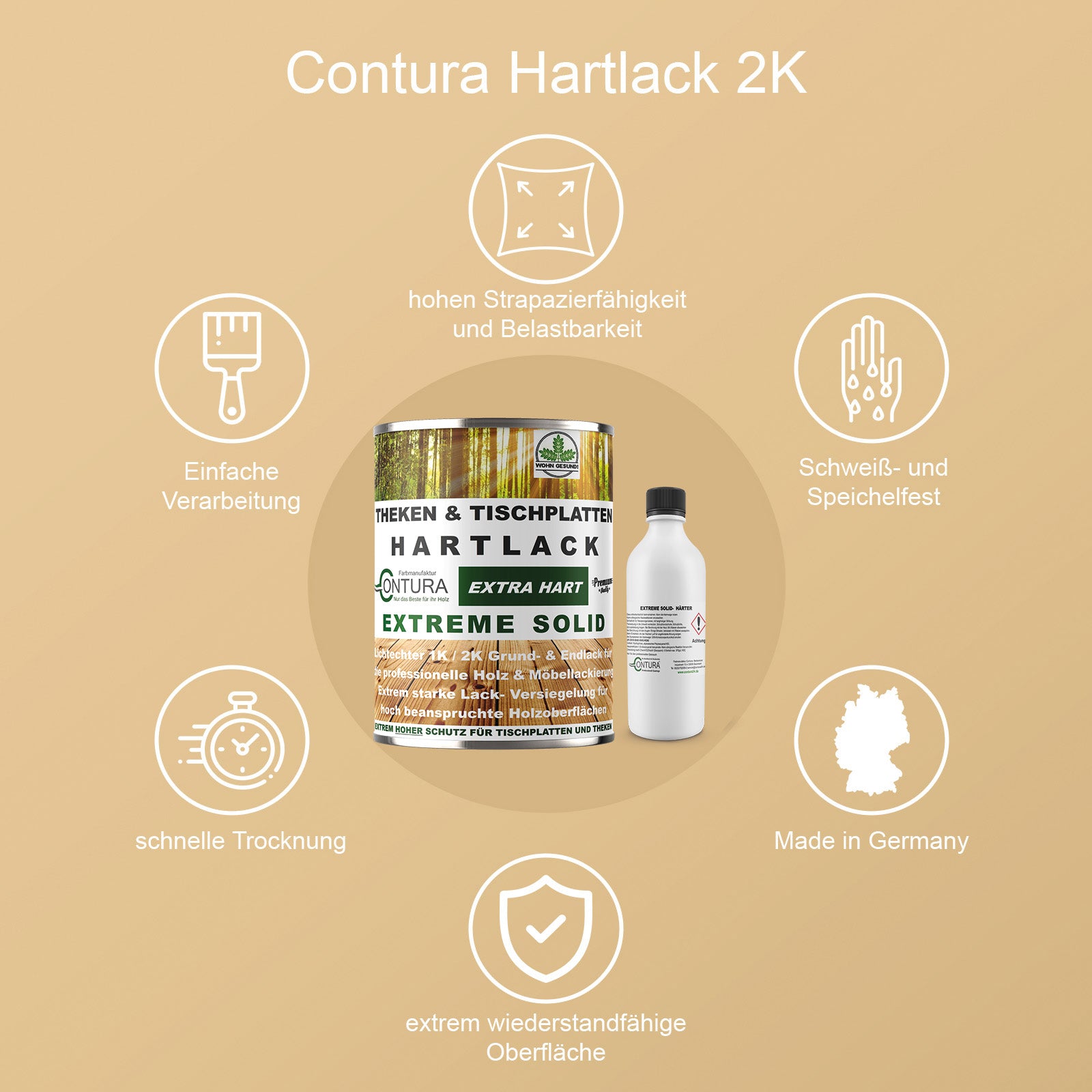 Der "Extrem Solid" Hartlack zeichnet sich zudem durch eine hohe Füllkraft, schnelle Trocknung, hohe Kratzfestigkeit, gute Schleifbarkeit und durch eine ästhetische Optik sowie extrem wiederstandfähige Oberfläche aus. Der Lack findet auf allen geschliffenen oder rohen Holzoberflächen seinen Einsatz. Auch zum nach- oder überlackieren (Verträglichkeit prüfen!) geeignet! Der Hartlack weist eine sehr gute Beständigkeit gegen Wasser, Alkohlische Getränke und sogar Chemiekalien auf, er besitzt eine hohe Licht und Kratzbeständigkeit! Seine Produktstärke liegt auch in der feinen Optik, die keine Wünsche offen lässt.