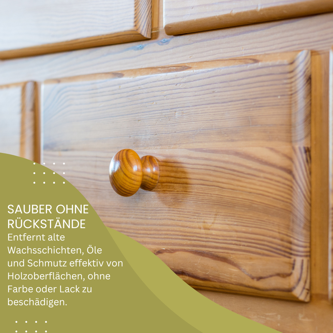 Trotzdem mit hoher Lösekraft, einfach und schnell zur kompletten Säuberung der Oberfläche. Entfernt gründlich alte Wachsschichten, Öle und Schmutz, ohne die Oberfläche, die Holzfarbe oder eine Lackoberfläche anzugreifen. Einfach auftragen, 10 Minuten einwirken lassen, anschleißend energisch abreiben und die Verschmutzungen lösen sich! Nach dem trocknen kann das Holz wieder frisch gewachst, geölt, gebeizt oder lackiert werden.
