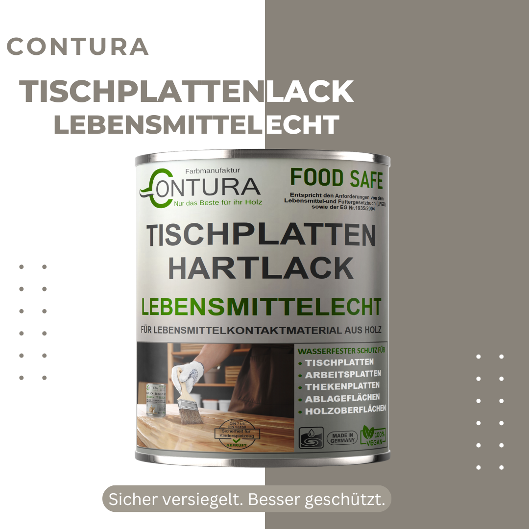 Contura lebensmittelechter Tischplatten- Hartlack (nach Anforderung des LFGB -Lebensmittel und Futtermittelgesetzbuch- sowie Verordnung Nr. 1935/2004) ist ein spezieller Lack, der für den Kontakt mit Lebensmitteln geeignet ist. Verwendet wird dieser Lack für Materialien und Gegenstände wie zum Beispiel Arbeitsplatten, Tischplatten, Thekenplatten, Warenausgaben (Flächen), die dazu bestimmt sind, mit Lebensmitteln in Berührung zu kommen, ohne dass Stoffe, die genügen würden, um die menschliche Gesundheit zu gefährden, in die Lebensmittel gelangen.
