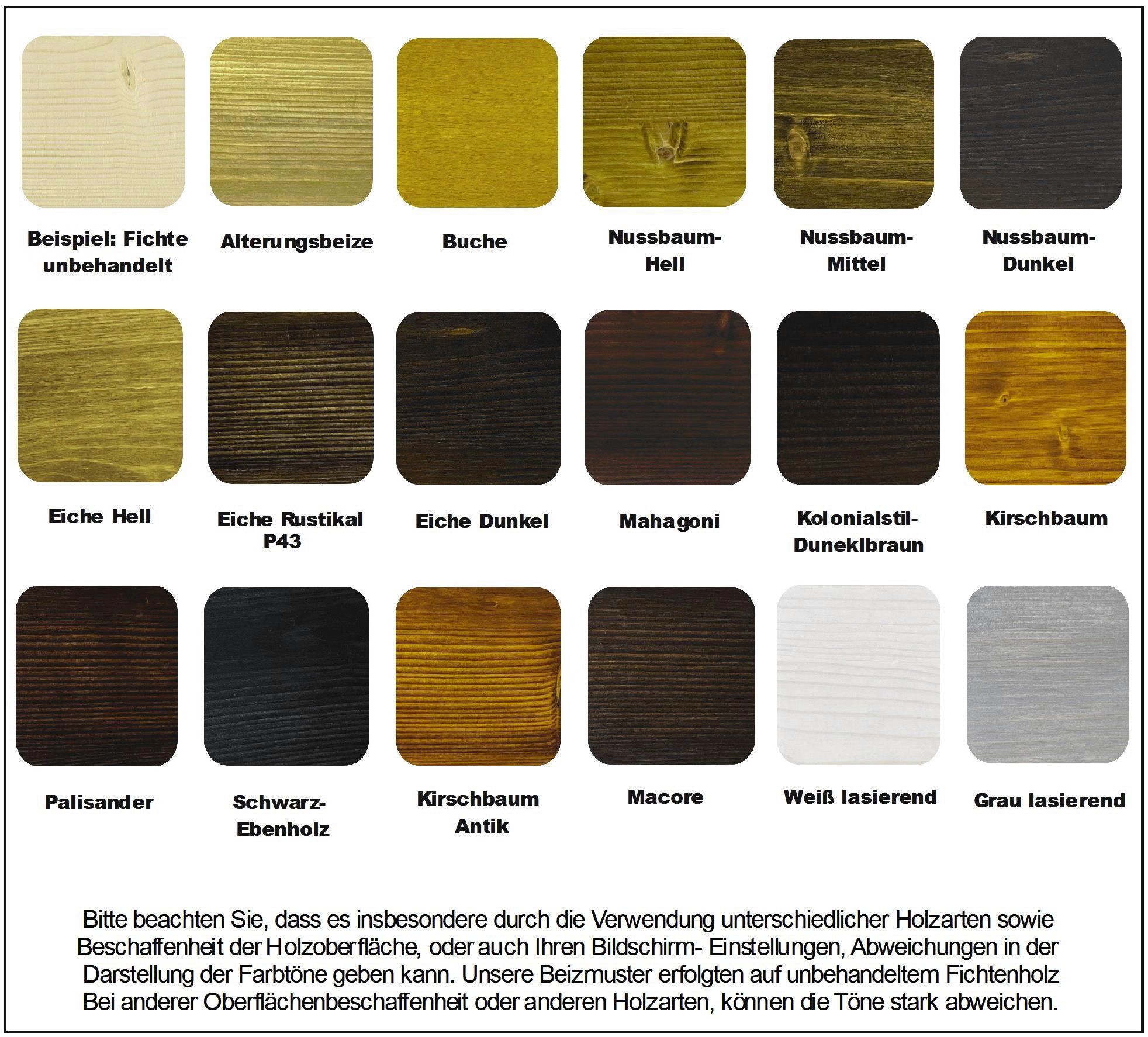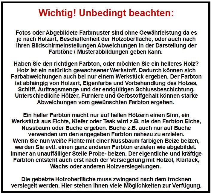 Farbmuster ohne Gewährleistung, da es je nach Holzart und Beschaffenheit der Holzoberfläche Unterschiede gibt!
