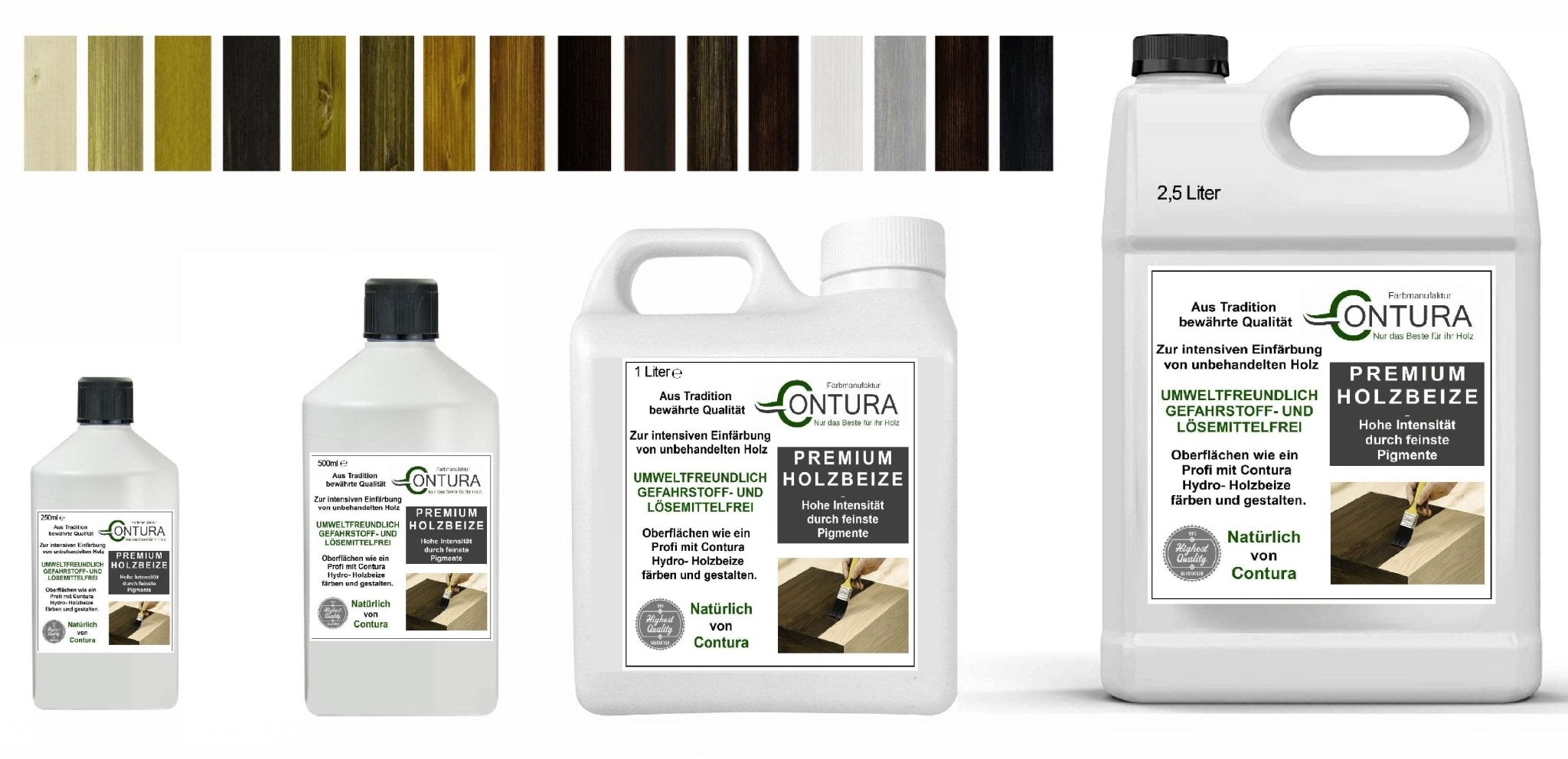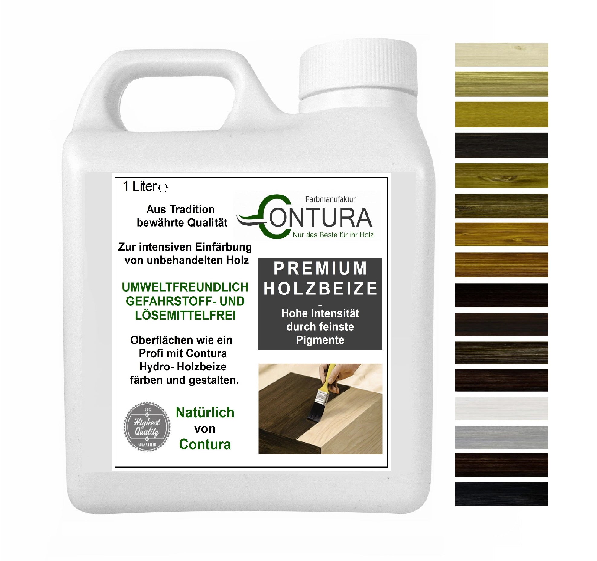 Contura Natur Holzbeize ist eine hochwertige, lösemittelfreie, ungiftige und gebrauchsfertige Holzbeize auf Wasserbasis mit feinstverteilten Farbpigmenten zur hohen Eindringtiefe! Ideal zum Beizen bzw. einfärben von rohen oder abgebeizten Holzoberflächen aus Weich- und Hartholz! Die gebeizte Oberfläche kann anschließend geölt, gewachst oder lackiert werden. Diese Beize ist eine sogenannte Positivbeize welche die Jahresringe, Maserung und Holzstruktur sehr schön hervorhebt. Nach dem Trocknen kann sofort gewachst, geölt oder lackiert werden. Die Farben sind untereinander mischbar. Tief eindringend in das Holz wird die Schönheit der Struktur maßgeblich erhöht! Contura Natur Holzbeize vom Profi in Tischlerqualität… das benutzt der Fachmann!