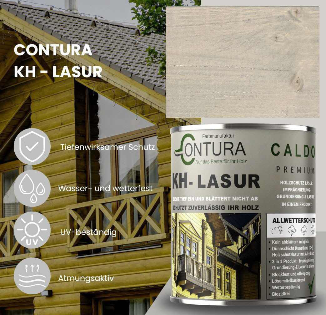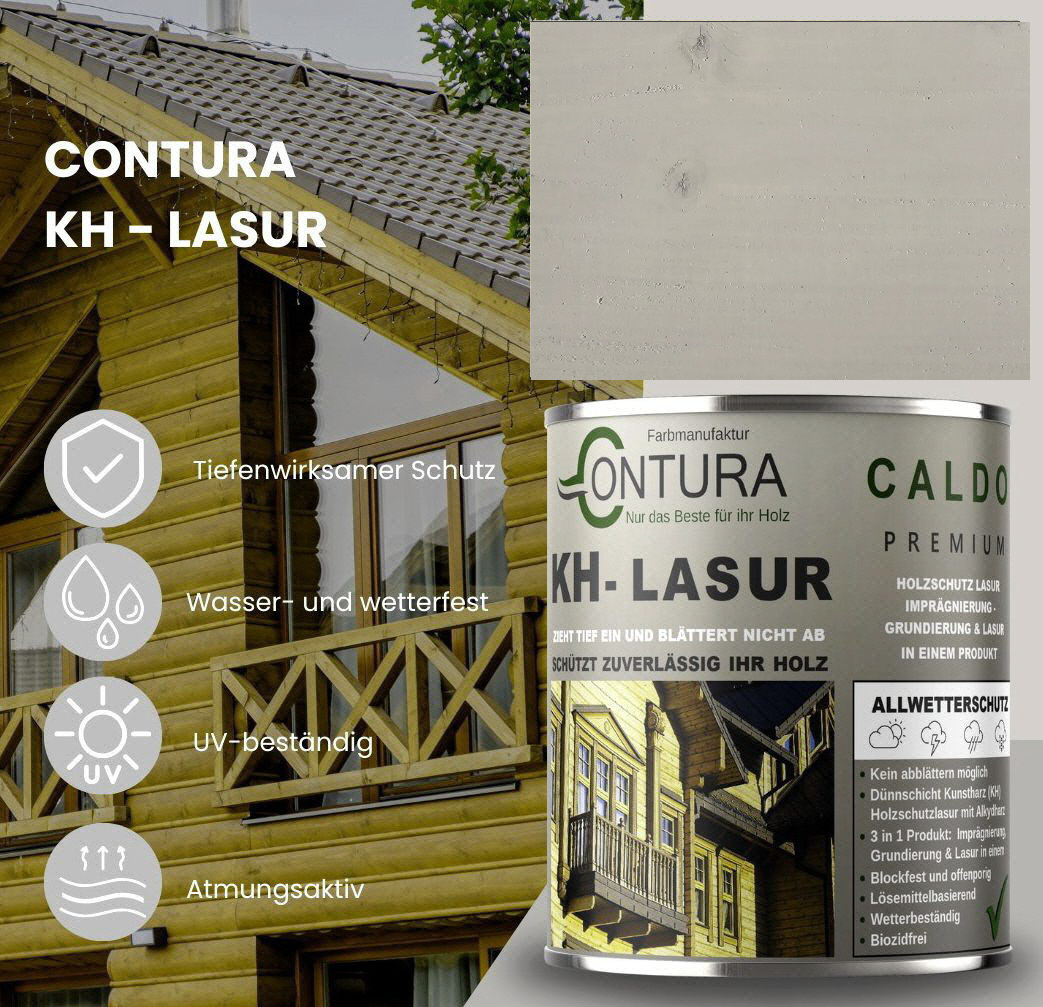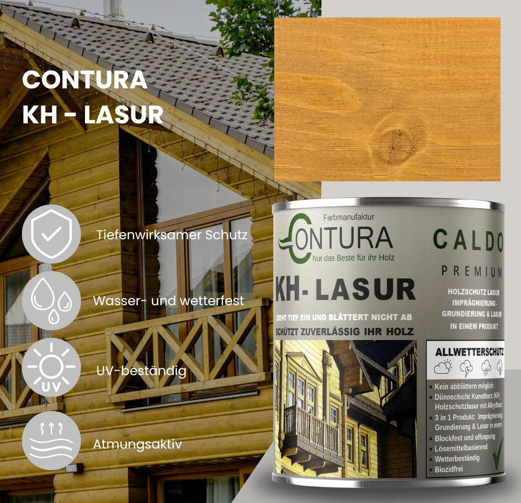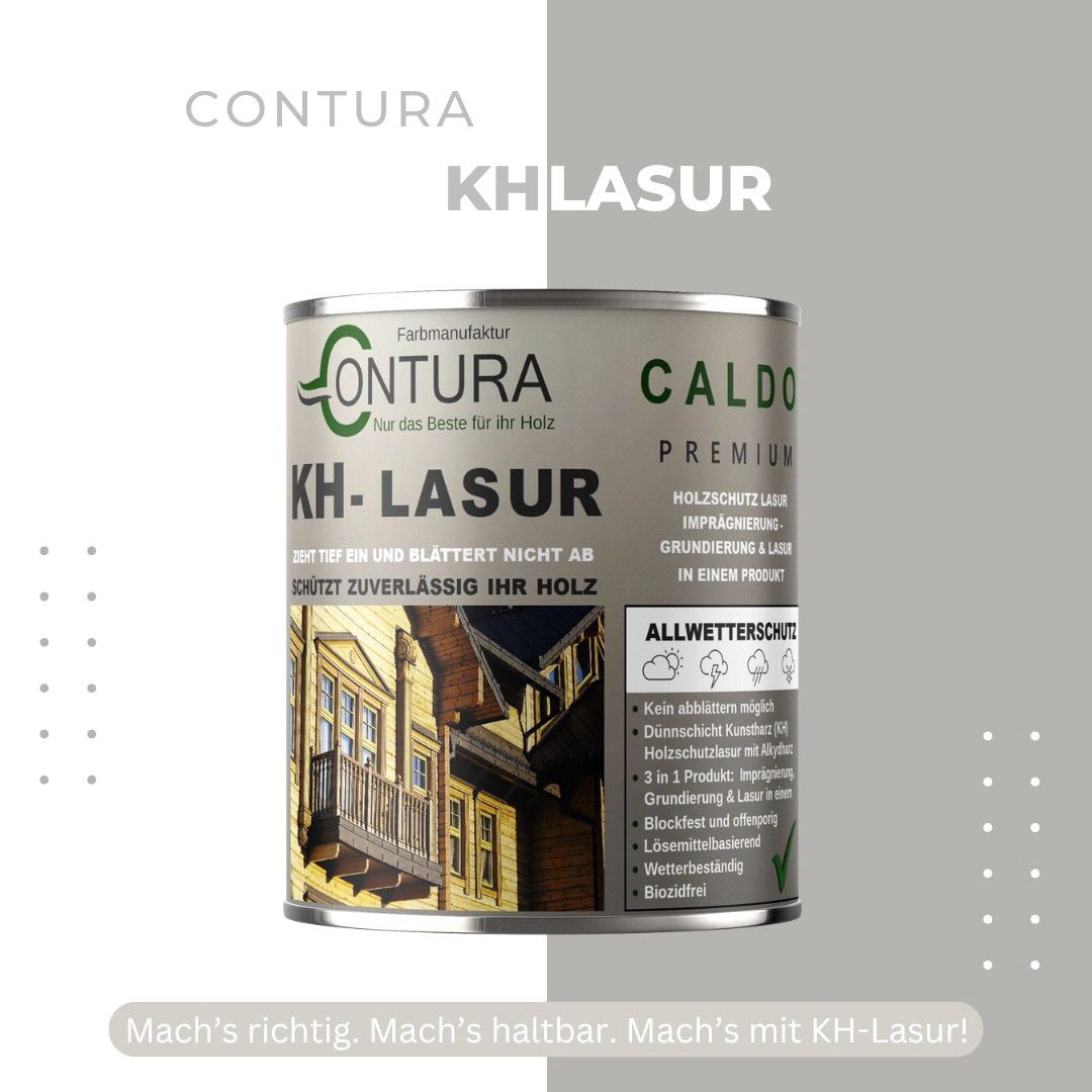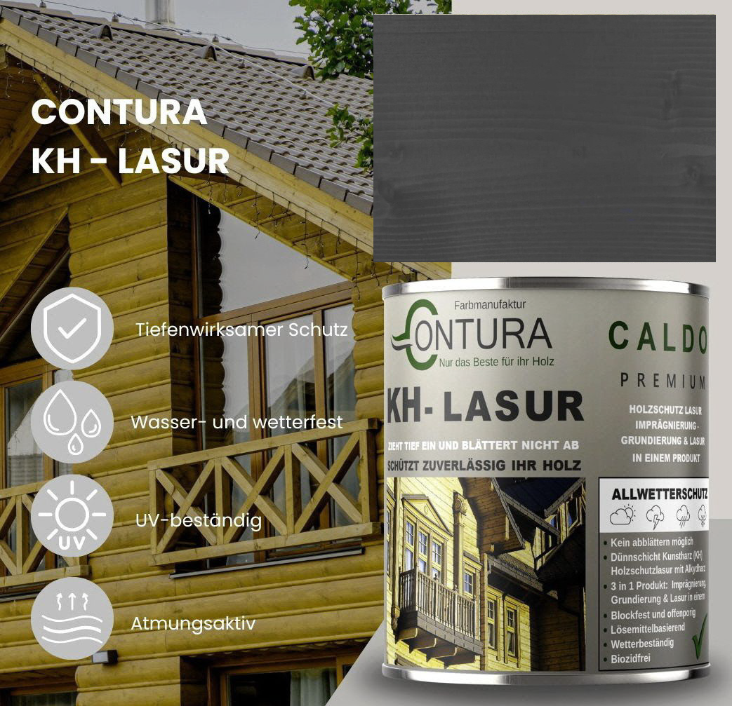 Contura KH Holzlasur ist eine hochwertige und sehr ergiebige, anwendungsfreundliche sowie offenporige Holzlasur in 14 Farbtönen mit Langzeitschutz aus der traditionellen Contura Farbmanufaktur. Angesagte Holzlasur Farbtöne für eine gelungene, lasierende Holzgestaltung. Neu und völlig im Trend sind die "Longterm Grey Protection", grauen Farbtöne aus der Farbauswahl. Die lösemittelhaltige Dünnschicht- Holzlasur dringt gut und tief in das Holz ein und wirkt wasserabweisend, feuchte regulierend und hochgradig wetterbeständig. Die Lasur blättert nicht ab und kann somit, auch nach Jahren, einfach übergestrichen oder mit einem dünnen Anstrich (ohne schleifen) nachgepflegt werden. Geben Sie Ihrem Holz im Außenbereich mit dieser Lasur einen zuverlässigen, langanhaltenden Schutz und lassen Sie Ihr Holz zum Hingucker im Garten werden.