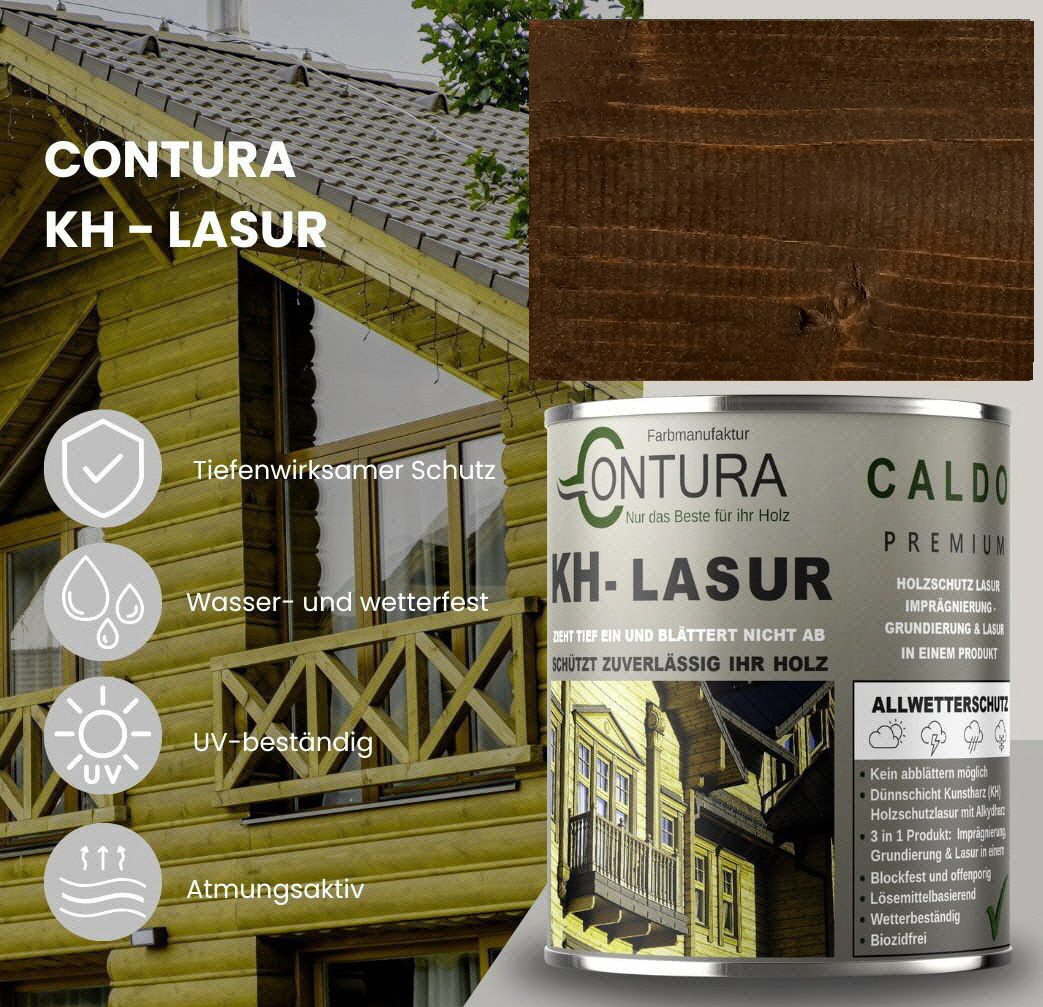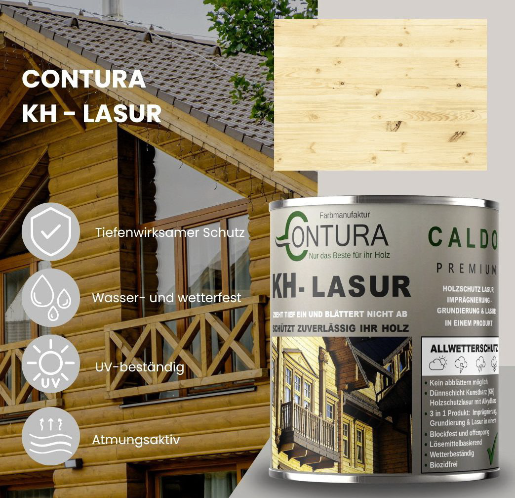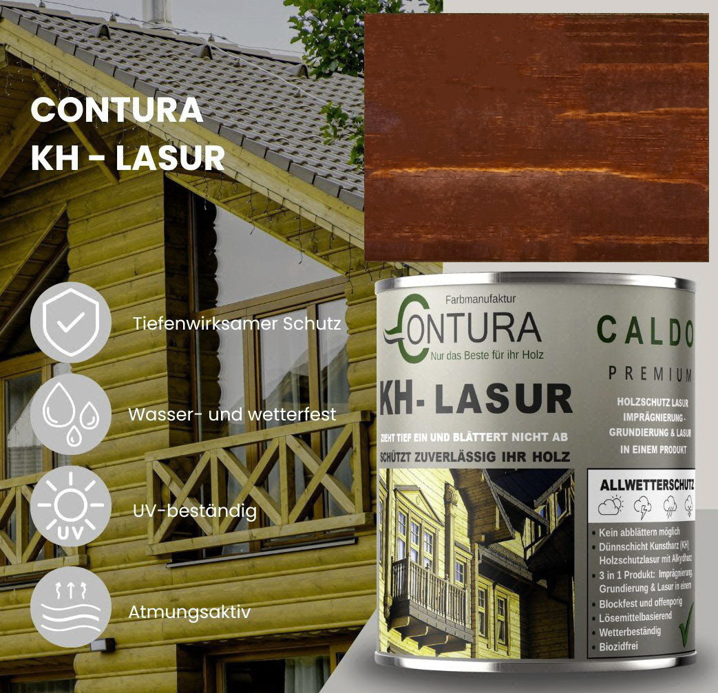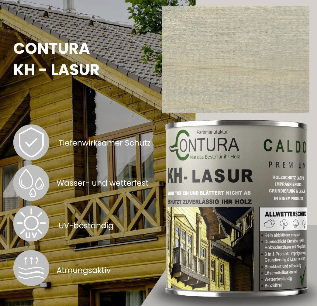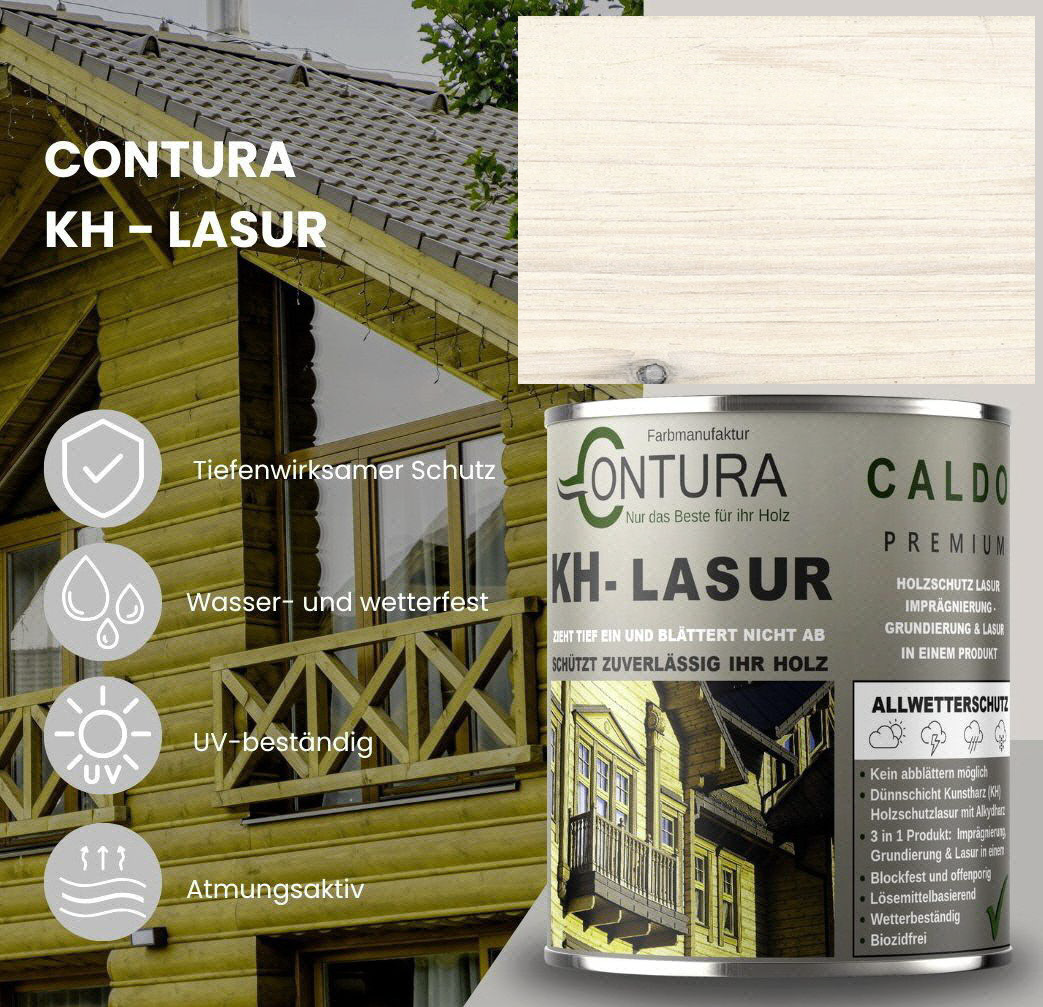 Contura KH Holzlasur ist eine hochwertige und sehr ergiebige, anwendungsfreundliche sowie offenporige Holzlasur in 14 Farbtönen mit Langzeitschutz aus der traditionellen Contura Farbmanufaktur. Angesagte Holzlasur Farbtöne für eine gelungene, lasierende Holzgestaltung. Neu und völlig im Trend sind die "Longterm Grey Protection", grauen Farbtöne aus der Farbauswahl. Die lösemittelhaltige Dünnschicht- Holzlasur dringt gut und tief in das Holz ein und wirkt wasserabweisend, feuchte regulierend und hochgradig wetterbeständig. Die Lasur blättert nicht ab und kann somit, auch nach Jahren, einfach übergestrichen oder mit einem dünnen Anstrich (ohne schleifen) nachgepflegt werden. Geben Sie Ihrem Holz im Außenbereich mit dieser Lasur einen zuverlässigen, langanhaltenden Schutz und lassen Sie Ihr Holz zum Hingucker im Garten werden.