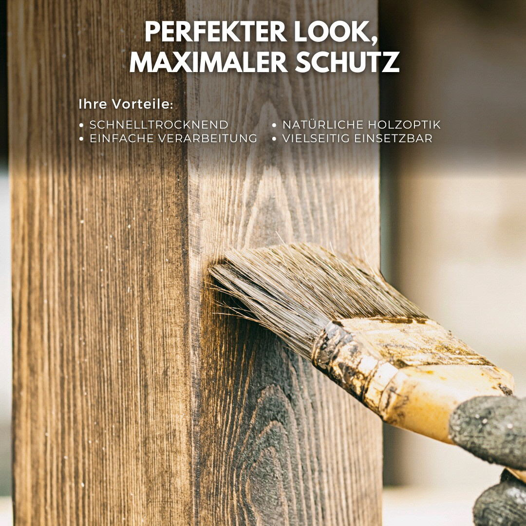 Dünnschichtige, dekorative Wetterschutzlasur / Holzlasur für holz schützende Erst- und Renovierungsanstriche in angesagten, grauen und Edelholzfarben für außen. Für alle nicht maßhaltigen Holzbauteile im Außenbereich wie Sichtblenden, Vordächer, Holzverkleidungen, Balkone, Pergolen, Carports, Palisaden, Gartenzaun, Terrassen und vielen anderen Holzbauteilen.