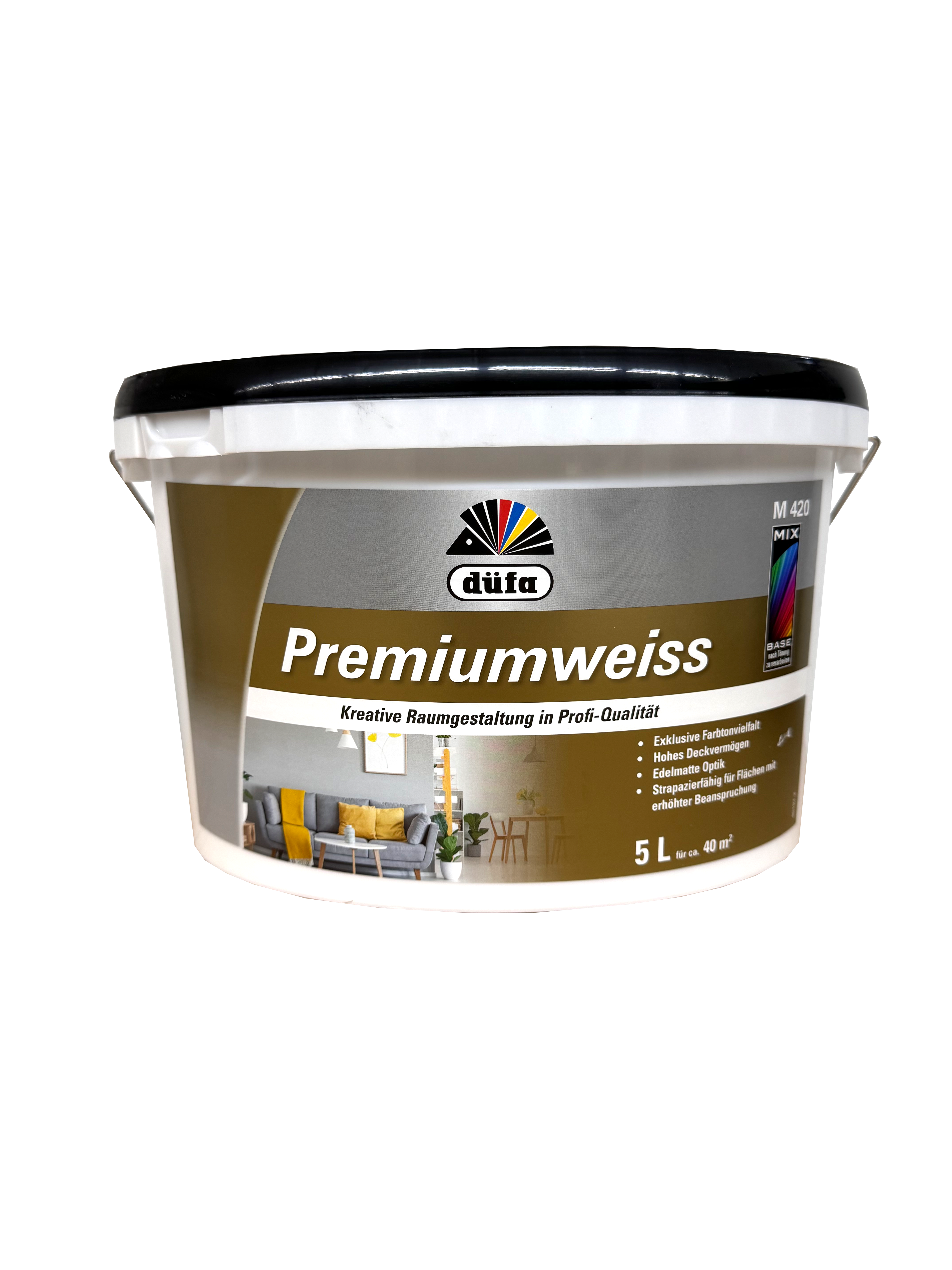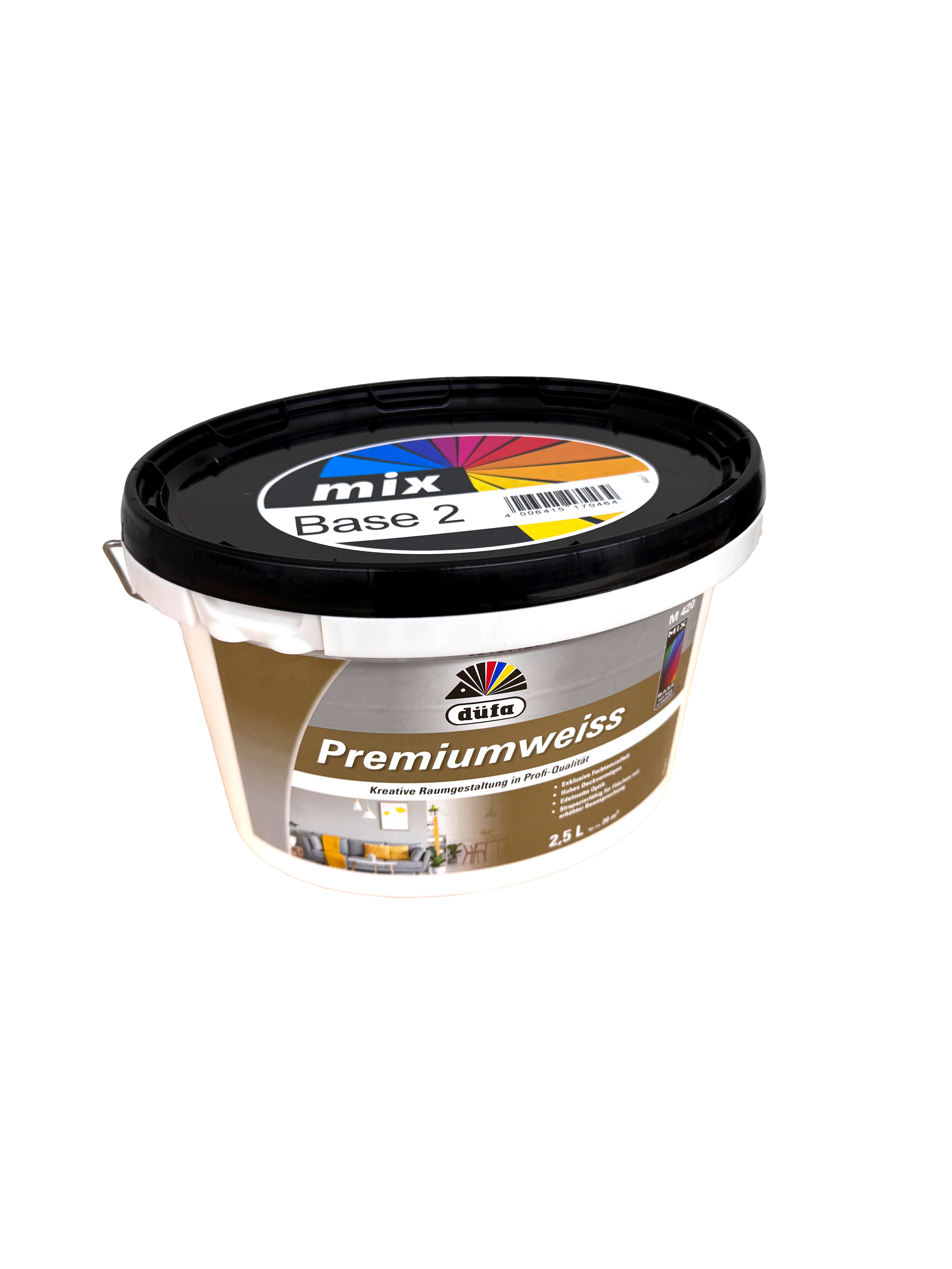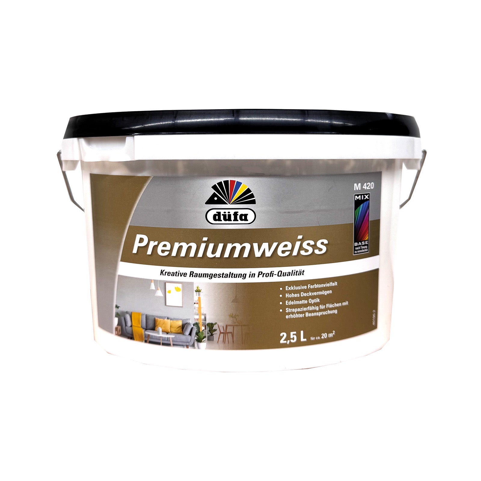 DÜFA Premium Color wird zur Premiumweiss MIX. Hoch deckende Wandfarbe mit überragenden Eigenschaften für strapazierfähige, scheuerbeständige Wand- und Deckenanstriche. Eignet sich für alle im Innenbereich vorkommenden Untergründe wie Putz, Beton, Mauerwerk, Papier- und Raufasertapeten sowie zum Überstreichen von intakten Altanstrichen auf Dispersionsbasis