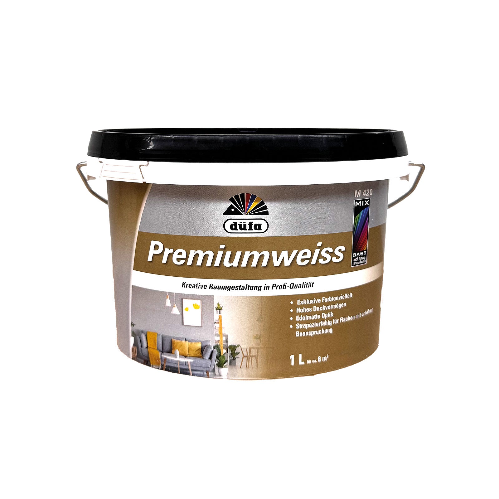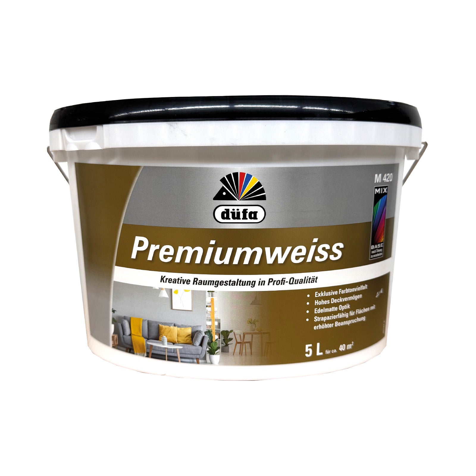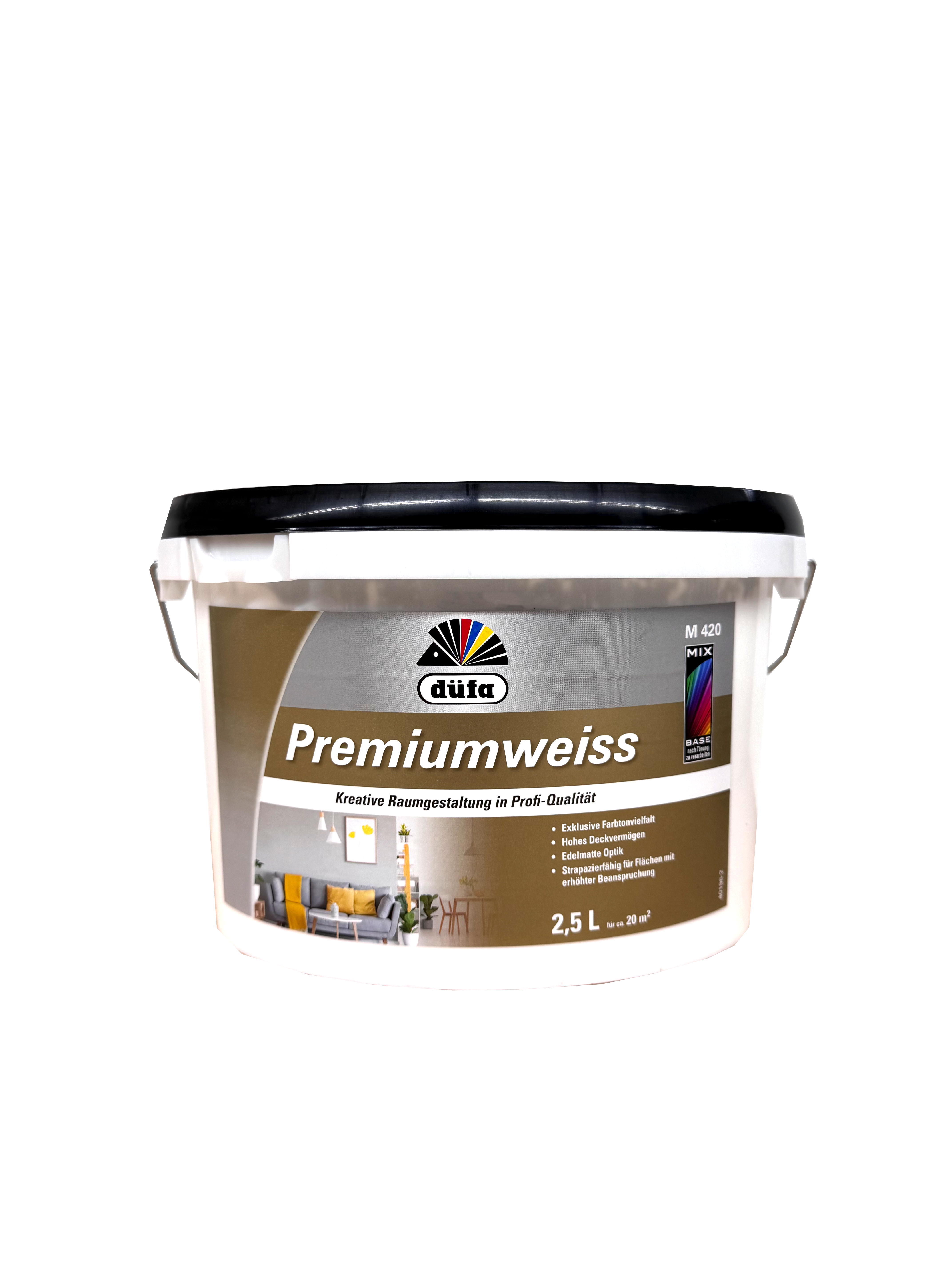 DÜFA Premium Color wird zur Premiumweiss MIX. Hoch deckende Wandfarbe mit überragenden Eigenschaften für strapazierfähige, scheuerbeständige Wand- und Deckenanstriche. Eignet sich für alle im Innenbereich vorkommenden Untergründe wie Putz, Beton, Mauerwerk, Papier- und Raufasertapeten sowie zum Überstreichen von intakten Altanstrichen auf Dispersionsbasis